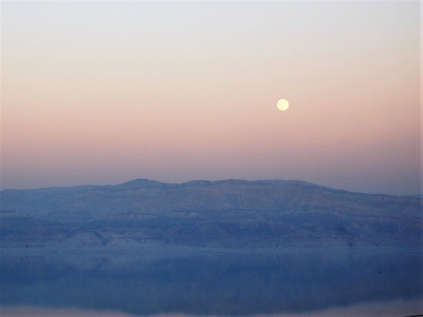 After dinner I took a short walk and snapped a few photos. The one below shows the moon above the Dead Sea, but doesn’t fully capture the effect due to the haze in the distance and reflection of the hills on the Jordanian side in the water.
