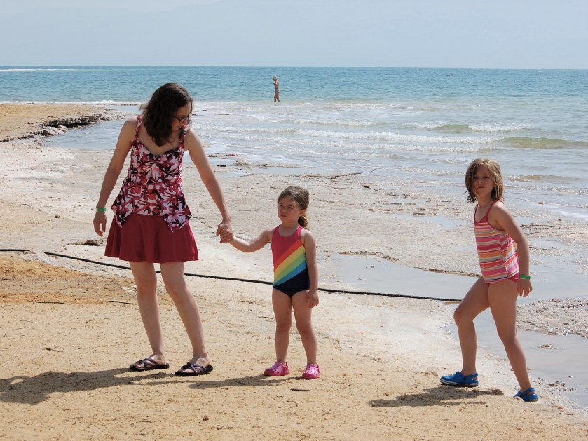 The girls were irritated by the Dead Sea water, and so we didn’t stay very long. The water was bathtub warm and you really can’t sink (lifeguard did not seem worried). Millie and I floated for a bit, but the bottom is really uneven and covered by cool looking salt/mineral deposits. After a short bus ride back to the hotel, Adena went to work and the girls and I went back to the pool. Dinner was at the hotel restaurant and there was a kosher meat spread with fun desserts. I discovered knishes with spicy ground beef filling. Here’s a shot of us on the walking path back to our room.
