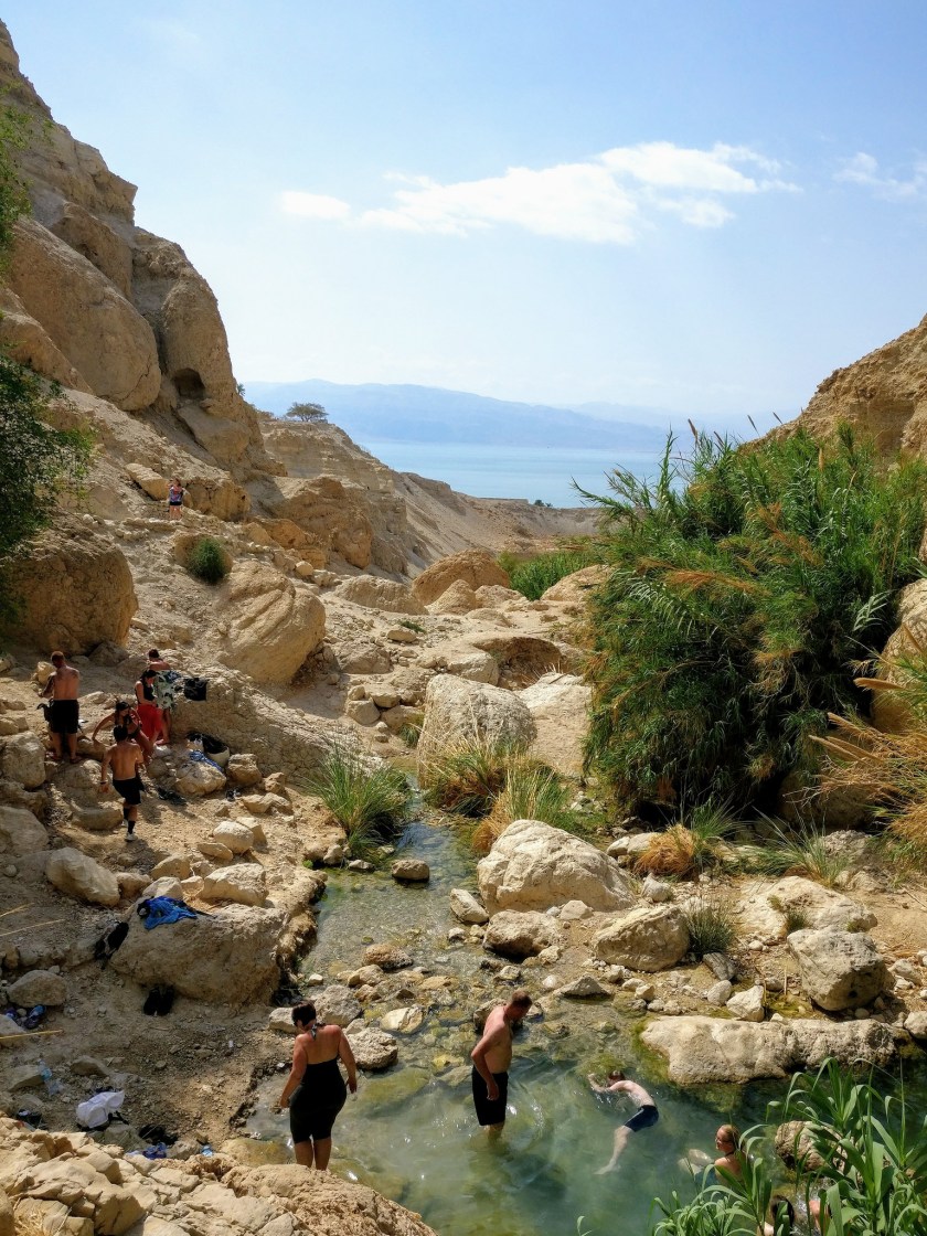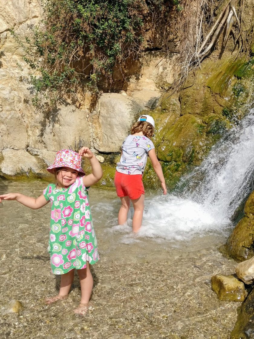 On Friday we got up early. After breakfast, Adena settled in to work and I took the girls on the bus to Nahal David, which is located in the Ein Gedi nature reserve. This spring-fed stream has water all year and is believed to be the place where David hid from King Saul in biblical times. Talk about going off the grid! There are waterfalls, pools deep enough for swimming, and great views of the Dead Sea.