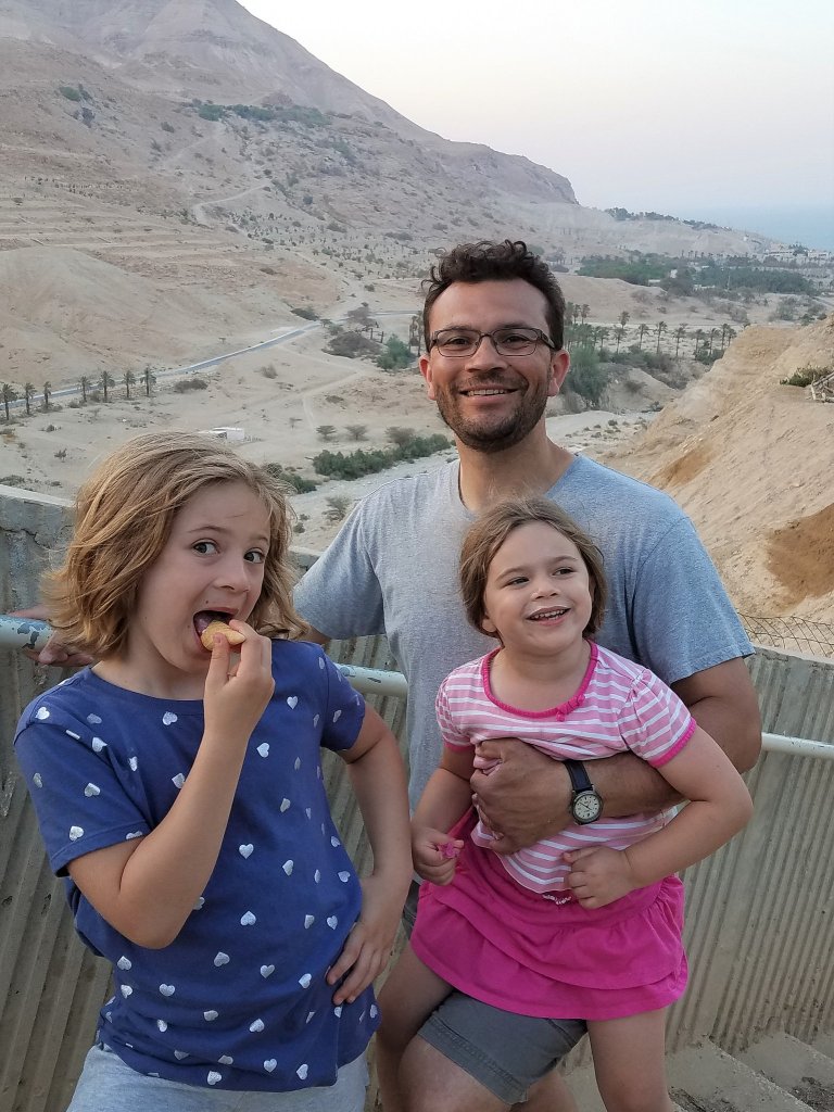 The girls were real troopers, but unfortunately we only had about an hour to spend. We would love to go back sometime. But with a car. My only gripe about Ein Gedi is that the activities (mud baths, rock climbing, an Essene archaeological site) are spread out and accessing them without a car is a hassle. A nice lady from Atlanta snapped this picture of the three of us at the second waterfall.