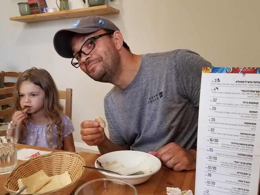 We had a leisurely breakfast at the Lehem Erez cafe on Moriya Boulevard. The food was good and a female patron who was smoking outside offered to put out her cigarette after the kids complained about the smell. She’ll thank them in twenty years.