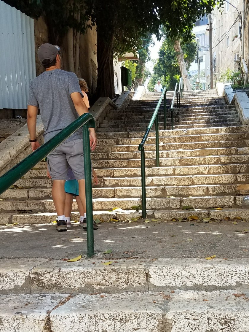 Here’s a picture of us trying to walk back up with full bellies. San Francisco has nothing on Haifa in terms of hills and steps. It is very humid here and it doesn’t take long to get drenched with sweat. For example, it is 84 degrees with 69% humidity, so it feels like 92 degrees right now.